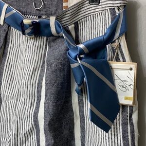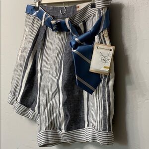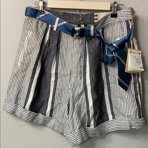 Koto Bolofo high waisted linen shorts size 10. NWT.Small mark on the belt as shown in pic.Faux front pockets.Inseam is 6” and rise is 12”. Laying flat waist is 16.5”.Grey and white stripes.Belt is blue.Cuffed at the bottom.