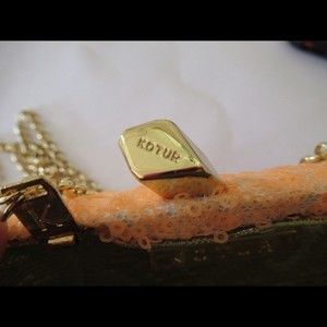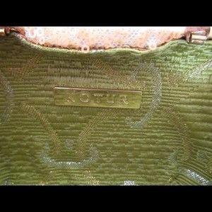 This is a new without tags Kotur brand clutch. The clutch is a vibrant bright orange. (little bit like a creamsicle color) with a green lining inside with gold and silver metallic accents. There is a gold chain strap also.