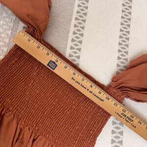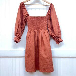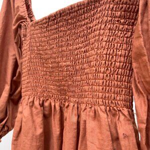 Kourt Portia Rust Smocked Mini Dress Puff Sleeve Square Neck Linen Blend Size S