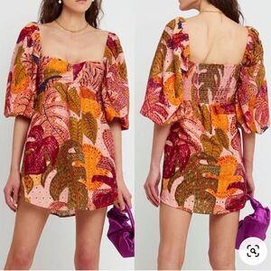 Kourt 🌴🦜 Robbie Palm Eyelet Puff Sleeve Mini Dress in shades of Peach/Orange/Pink/Green. Absolutely stunning!!! This dress has square necklines with a sweetheart bust and smocked back. Flares after and empire waistline. Size Small. Brand new and never worn. New with tags.