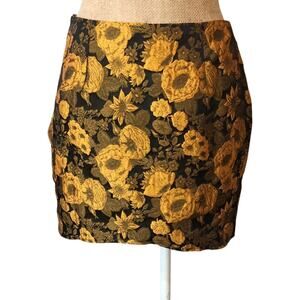 The skirt has an asymmetrical hem, a back zipper, and a lining. Both pieces are made from a unique jacquard fabric with a black, yellow, and gold floral pattern.