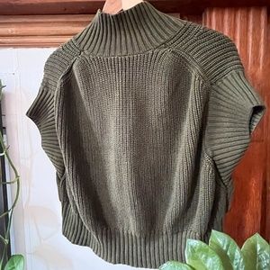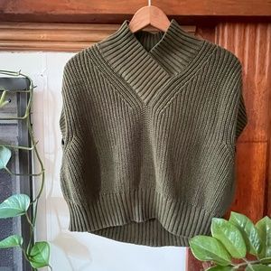 This is a never-worn, tags-attached Kowtow sweater vest in moss green. Designed for a relaxed fit to allow for layering, the Unity Vest is a tuck stitch knit fully-fashioned in a waste-free process from 100% certified Fairtrade organic cotton. It features a high, wrapped V neck and dropped shoulder, and is finished with wide rib detailing at the neck, hem and cuff. Covers the shoulder for an office-appropriate look that transitions effortlessly into casual wear.