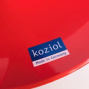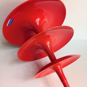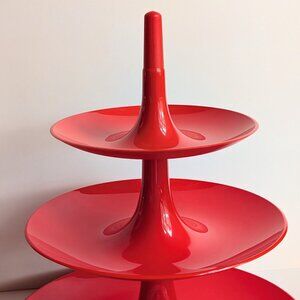 Iconic three-tier red plastic etagere by Koziol, measures approx 12" diameter and 13.5" tall.