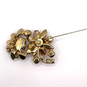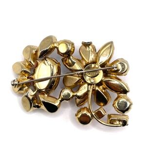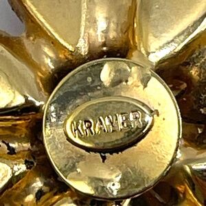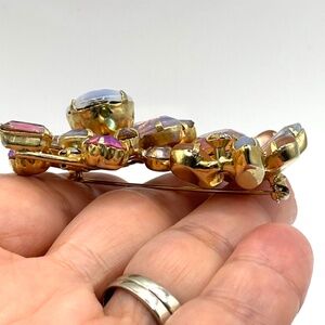 Kramer signed vintage satin glass and faceted crystal pin brooch from the 50"s (after 1955). This is a stunning multi-color brooch featuring faceted pink crystals, tear drop shape satin gold colored glass, iridescent oval cabochon and marquise shape stones. Double flower design. Gold tone setting. All stones are present. There is one TINY scratch on the iridescent blue oval shaped stone -- hardly noticeable without the camera. All stones are prong set. The finish is in very good condition and the clasp works as it should. Signed Kramer on the back. Dimensional. See photos for size. A gorgeous vintage piece.
