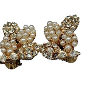 Elegant vintage clip-on earrings from the 1940s featuring faux pearls and rhinestones set in gold tone. Signed by Kramer, these timeless accessories add a touch of glamour to any outfit.