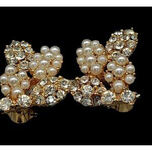 Kramer Vintage 1940s Clip On Earrings Faux Pearl Rhinestones Gold Tone Signed
