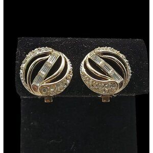Elegant vintage clip-on earrings by Kramer, featuring a gold-tone finish with sparkling diamante accents. These high-end estate round studs are perfect for adding a touch of glamour to any outfit.