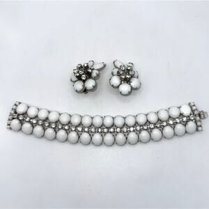 Kramer of New York silver tone milk glass rhinestones bracelet clip on earrings