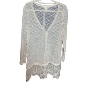 Krazy Kat Ivory Cream Open Knit Long Sleeve Button Front Lace hem Top