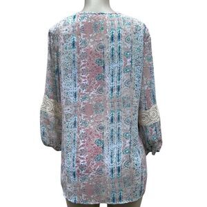 Krazy Kat Tunic Blouse Women's Large Multicolor Floral Crochet Lace Trim 3/4 Sleeve