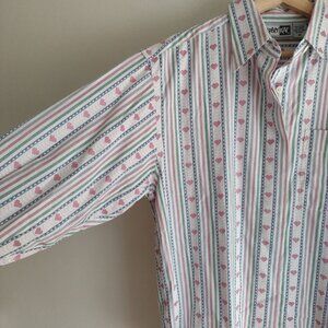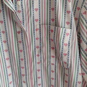 Lightweight and breathable, this striped button-up shirt features a playful heart pattern. Relaxed fit, could fit a large