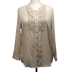 Krazy Kat Womens XL Light Khaki Cotton Tunic Top Crochet Button Front Boho Style