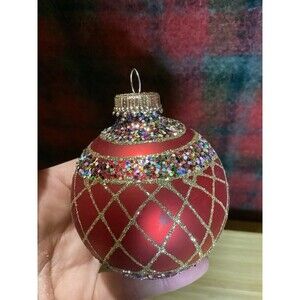 This product is a set of 8 vintage Krebs Glass Christmas ornaments featuring a candy apple red design with flame stripes and lattice. Made in Mexico, the round ornaments are medium in size and crafted from glass with glitter accents. Perfect for the holiday season, these elegant ornaments are ideal for collectors and are suitable for recipients of all ages. The ornaments come in two boxes and are part of the Christmas By Krebs product line, adding a touch of festive charm to any Christmas tree.