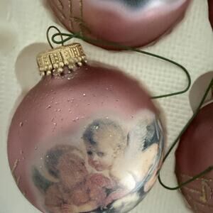 Krebs Glass Christmas Ornaments Glitter Cherub Music Notes Dusty Rose 4-2.5" VTG