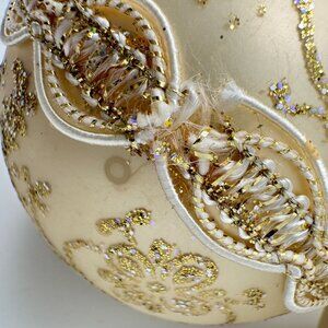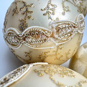Krebs Glass Victorian Christmas Ornament Set Of 4 Cream Gold Glitter Vtg 2.5"