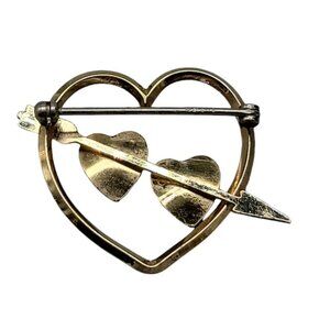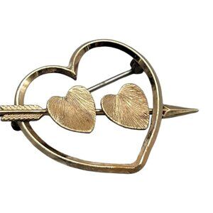 This Krementz Gold Plated Brooch is a vintage signed piece that features a charming triple heart & arrow design. It's a stylish accessory that adds a touch of classic elegance to any outfit.