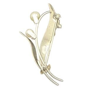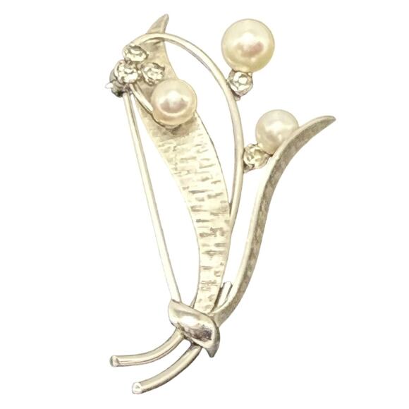Vintage signed Krementz floral bouquet brooch, from the 1960's, features genuine pearls and clear rhinestones set in finely etched silver-tone metal. Three pearls and five round-cut rhinestones form an elegant floral motif with textured leaf details. Back is stamped “Krementz,” confirming maker authenticity. Secure rollover safety clasp works properly. Measures approximately 1.9" W x 1.1" H. Excellent vintage condition.