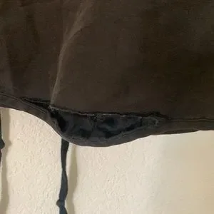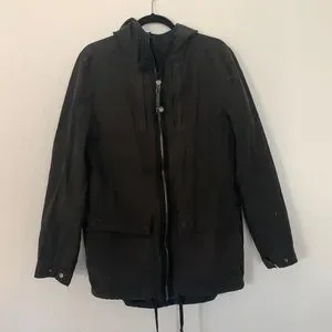 Krew men’s hooded jacket. Size large. Black with buttons on sleeves. Rip in seem on the back bottom, shown in pictures.