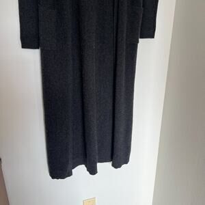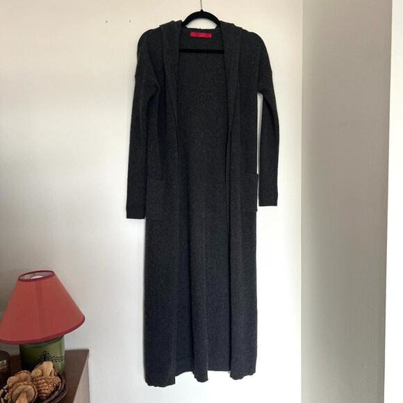 In good preowned condition. Soft knit. Longline, max-length cardigan sweater with a hood. 70% wool and 30% cashmere.