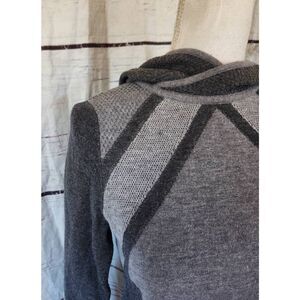 Two-tone gray wool blend hooded sweater with stripes on the sleeves and textured on the side. In good condition with light pilling and fuzziness due to the material.