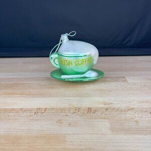 Celebrate the holidays with a unique Kris Kringl glass ornament shaped like an Irish coffee cup! Featuring a glittery green cup with foam detail and "Irish Coffee" written in gold lettering, this ornament is perfect for coffee lovers or anyone looking to add a festive and fun touch to their Christmas tree. Comes in its original box for safe storage.