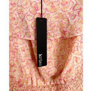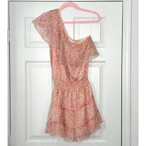 An all-in-one piece, this one shoulder mini dress features a smocked waist, ruffle detailing and a delicate animal print.