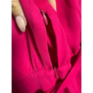 This vibrant hot pink mini dress makes a bold, feminine statement with its chic one-shoulder design and flowing silhouette. The dress features a single long sleeve with a softly gathered cuff, balanced by a sleeveless side that highlights the neckline and shoulders. A fitted waist with a subtle tie detail enhances the figure, while the lightweight fabric drapes gracefully into a flirty ruffled hem that adds movement and charm.