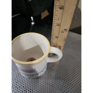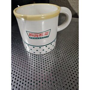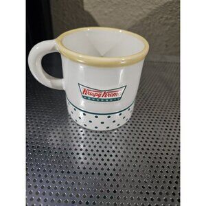 The product is a vintage Krispy Kreme doughnut coffee mug with a unique design featuring green dots and a 3D donut on the bottom inside the cup. This collectible advertising item falls under the theme of bakery and baking, making it a must-have for fans of cakes and doughnuts. The whimsical and colorful design adds a fun touch to your morning cup of coffee while also serving as a nostalgic piece of memorabilia.