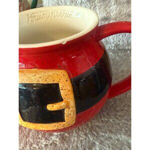 This ceramic mug features a festive Santa belt design and embossed Krispy Kreme branding, ideal for holiday beverages or as a collectible item.