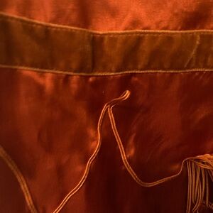 This elegant orange skirt is perfect for any occasion. Its vibrant color adds a pop of style to your wardrobe. Satin with felt & cord embellishments. Flat front with elastic back. Rust/fall colors. The bottom has areas that are perhaps not completely tacked or need to be steamed so please be mindful of that, but this is a lovely piece by KL The waist measures approximately 14” laying flat but stretches to about 21” & is approximately 38” long. Please note measurements are approximate No stains tears or holes Smoke free Sold as is Smoke free, pet friendly home Feel free to ask questions