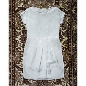 Kristensen du Nord Light Grey Silk Cloudy Dress size 1 US Small, gently used--no rips, stains, or holes, made in Italy, boat neck, cap / kimono short sleeves, slightly dropped waist, inverted box pleat with knife pleat on either side at both front and back, seam hip pockets, relaxed fit, hits about at or below knee depending on height, mottled soft light grey semi-sheer light-weight woven self, I believe a slip missing, 100% silk with 100% cotton (missing?), continued in comments