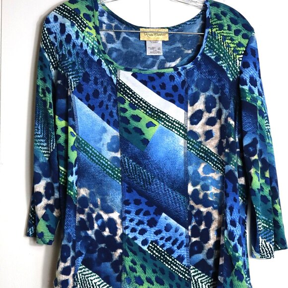 Kristin Crenshaw Blue Leopard Print 3/4 Sleeve Square Neck Women's Top Large