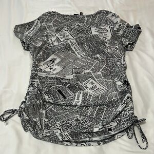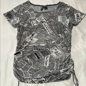 Kristin Nicole Newspaper Print Ruched Drawstring Side T-Shirt