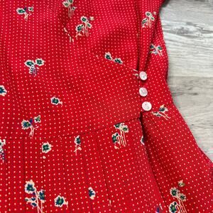 Adorable vintage-inspired red dress from Kristinit featuring a floral ditsy print with white polka dots, gathered waist, and a front pleated skirt with side button detail. Made in the USA. Lightweight and romantic—perfect for spring strolls and iced lattes.