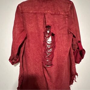 Stylish red distressed button-up shirt with rolled sleeves and frayed hem.