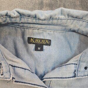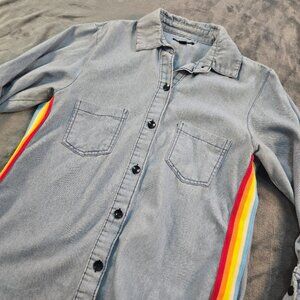 Kroix Shirt Womens Medium Blue Chambray Longline Distressed Rainbow Tunic