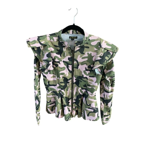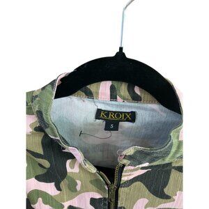 Kroix Womens Size Small Camo Ruffle Shoulder Flare Hem Full Zip Jacket Coat y2k Vintage pink green