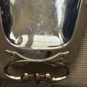 The Kromex Platter is a vintage serving tray made of silver metal, featuring a simple design with no pattern. With a length of 17.5" including handles, this original piece from the United States is perfect for all occasions. Vintage in style, this Kromex platter is sure to add a touch of retro charm to your table setting.