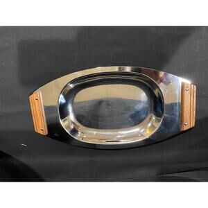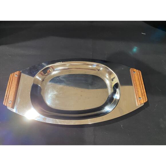 12.5" long, 6.75" wide chrome tray with walnut handles. Beautiful pre-owned condition.