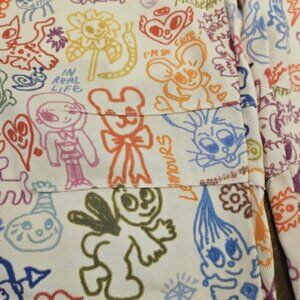 A wearable art piece from Krush Kandy’s earlier drops—these jeans are no longer in production, making them a rare find for collectors and streetwear lovers. White denim saturated with chaotic, colorful graffiti-style graphics: cartoon faces, abstract symbols, and punchy slogans like “HUMAN MADE,” “DRY ALLS,” and “GEARS FOR FUTURISTIC TEENAGERS.” Every inch is expressive.