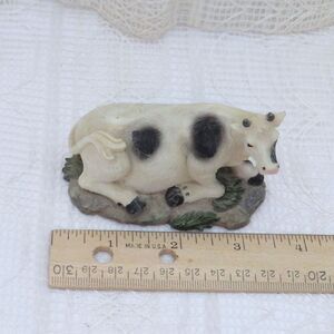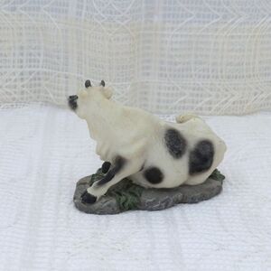 This adorable vintage black and white Holstein cow figurine is made by K's Collectibles. It is made from resin and features a cow lying down on the ground. It is 2 1/2 inches tall, 3 1/2 inches long, and 1 3/4 inches wide. This cow is perfect for farmhouse or country decor.