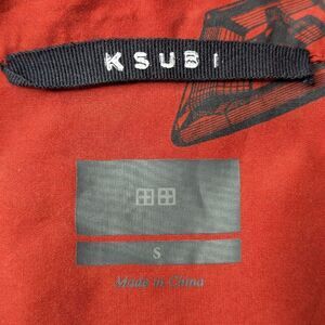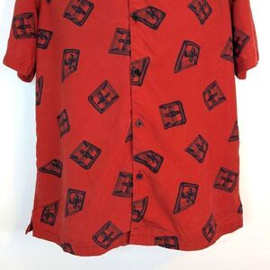 Description: Ksubi Red 3D Print Resort Maximalist Streetwear Button Down Shirt SM, camp shirt in deep red, pressed open collar, lightweight fabric made of sustainably produced fiber using closed-loop processing, floating graphic design throughout