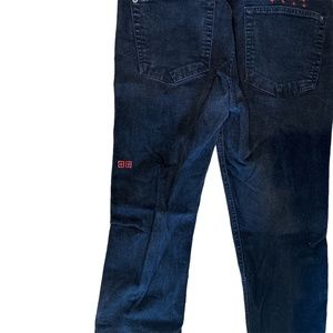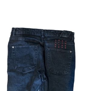 I believe these are the Chitch Laid Black jeans. Mid-rise slim-fit denim jean. Black. Constructed from a heavy-duty 98.4% cotton, 1.6% elastane. Premium stretch denim sourced from Turkey. Contrasting red colour embroidered logo on the back. No pocket tag. Inseam 24"