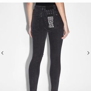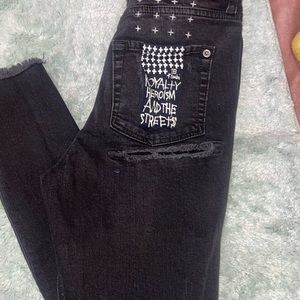 black distressed ksubi jeans.. i’ve distressed these jeans myself more than the original state. pictures included also these have some stretch. definitely one of my favorites