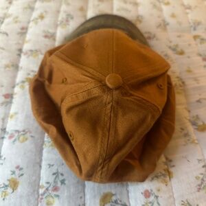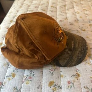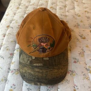 Orange hat with camo bill. Features embroidered design of a dog with a bird in its mouth.