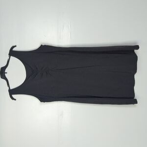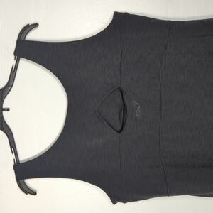 Gray. V neckline with ruching at the bodice. Cute cut out detail on the back. Built in shelf bra (no padding). Flaws: some pilling and there is a hole starting at the seam underneath the bust. May be fixable because it's right on the seam, but I'm just not that handy. The size tag is printed on the back of the dress and is significantly faded, but you can still make out parts of it. Pit to pit measurement: 21 inches. Waist measurement: 20 inches. Length shoulder to hem: 39 inches.