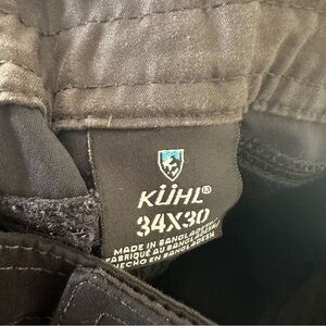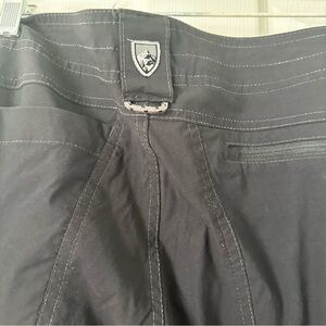 These Kuhl cargo pants in black offer a sleek and functional design, featuring a straight leg cut and elastic detail at the bottom. Crafted from a durable fabric, they are perfect for both casual outings and outdoor adventures.