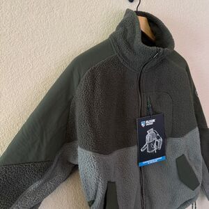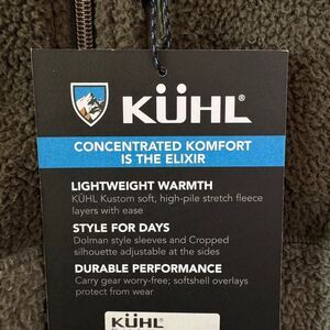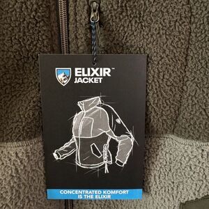Cozy, warm, soft fleece jacket. The Elixir jacket from Kuhl features a cropped silhouette with adjustable sides. High-pile soft stretch fleece. Soft shell material at shoulders to protect when wearing gear. Mock neck style with full zip. Two front pockets and one zip chest pocket. Color is a mossy green with gray undertones.