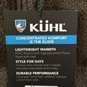 Cozy, warm, soft fleece jacket. The Elixir jacket from Kuhl features a cropped silhouette with adjustable sides. High-pile soft stretch fleece. Soft shell material at shoulders to protect when wearing gear. Mock neck style with full zip. Two front pockets and one zip chest pocket. Color is a mossy green with gray undertones.