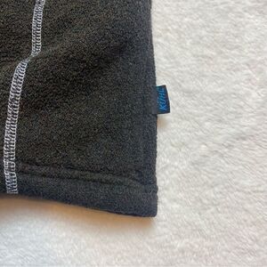 Kuhl Fleece Front Zip Gray and Dark Brown Jacket Size Small. Excellent used condition. Alfpaca fleece. Stand up collar. 2 pockets. Thumb holes at cuffs. Measures chest 37", length 23", sleeve 23".